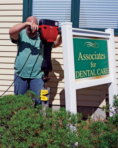“The posts for this sign were installed using a post anchor system called OZ-Posts, which are galvanized steel post anchors that you drive into the ground—without digging a hole. They are 3-ft. long and taper to a point, and are available at many building materials stores. You drive them in with an electric jackhammer using a special fitting on it. Then you insert a post into the OZ-Post and screw or bolt through it to secure the post. They come in 4×4, 6×6, 8×8 and 10×10 post sizes, for round or square posts. There are several advantages to this method over digging holes. First, since you drive the OZ-Post into the ground, you aren’t trying to backfill and pack dirt around the post, so they’re much more stable than a dug hole. They’re also removable—you can pry them right out of the ground and reposition the post. If they hit a rock on the way in, they usually deflect and you can continue driving them in. I can drive an OZ-Post right into frozen ground, too. In Vermont, it’s not uncommon to have two feet of frozen dirt to dig through in midwinter. It’s like two feet of concrete. To drive in the OZ-Posts, I use an electric jackhammer powered by a portable generator. Even in midwinter, I can install a sign with this system in 20 or 25 minutes. In frozen dirt, it can take four hours to dig two holes. The dirt comes out in chunks just like concrete. I’ve been using them for five or six years with no problems. They save a lot of time and work great. The only time I don’t use them is if the sign has a large surface area and is in a high wind area, or if the posts are over 8 feet above grade. I’ve often gone back to check the installation in the spring to see if the posts might be loose, but they’re always fine. I’ve had a couple in windy locations lean a bit over time, but I just pulled them out and reset them. It’s a very practical system.”