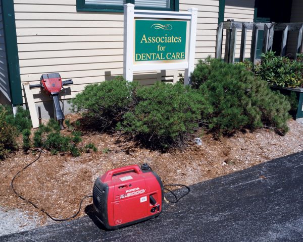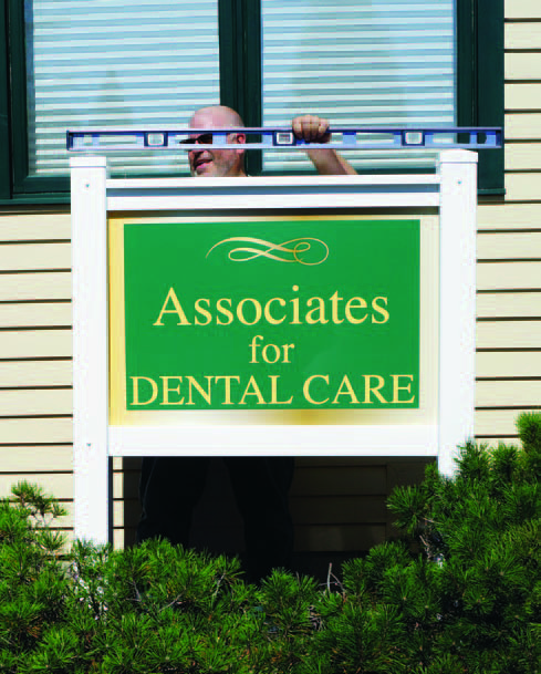 “The posts for this sign were installed using a post anchor system called OZ-Posts, which are galvanized steel post anchors that you drive into the ground—without digging a hole. They are 3-ft. long and taper to a point, and are available at many building materials stores. You drive them in with an electric jackhammer using a special fitting on it. Then you insert a post into the OZ-Post and screw or bolt through it to secure the post. They come in 4×4, 6×6, 8×8 and 10×10 post sizes, for round or square posts. There are several advantages to this method over digging holes. First, since you drive the OZ-Post into the ground, you aren’t trying to backfill and pack dirt around the post, so they’re much more stable than a dug hole. They’re also removable—you can pry them right out of the ground and reposition the post. If they hit a rock on the way in, they usually deflect and you can continue driving them in. I can drive an OZ-Post right into frozen ground, too. In Vermont, it’s not uncommon to have two feet of frozen dirt to dig through in midwinter. It’s like two feet of concrete. To drive in the OZ-Posts, I use an electric jackhammer powered by a portable generator. Even in midwinter, I can install a sign with this system in 20 or 25 minutes. In frozen dirt, it can take four hours to dig two holes. The dirt comes out in chunks just like concrete. I’ve been using them for five or six years with no problems. They save a lot of time and work great. The only time I don’t use them is if the sign has a large surface area and is in a high wind area, or if the posts are over 8 feet above grade. I’ve often gone back to check the installation in the spring to see if the posts might be loose, but they’re always fine. I’ve had a couple in windy locations lean a bit over time, but I just pulled them out and reset them. It’s a very practical system.”